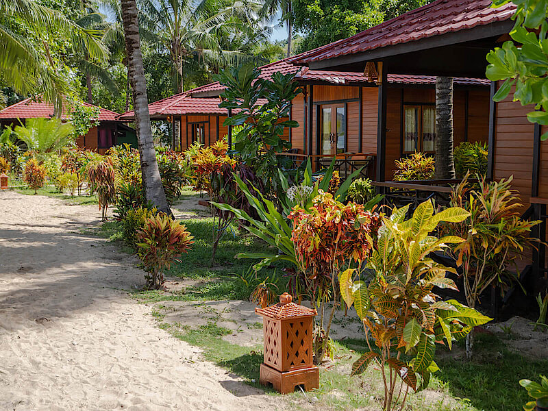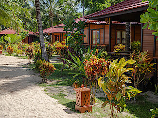 Die liebevoll dekorierten Strandbungalows sind mit nachhaltigen Bambusmöbeln (Bambusbett, Bambusschrank, Moskitonetz, 2 Ventilatoren) und einem Keramikfußboden ausgestattet und sorgen für eine helle, freundliche Atmosphäre. Die geräumigen Bäder verfügen über Dusche, WC und Waschbecken nach europäischem Standard.